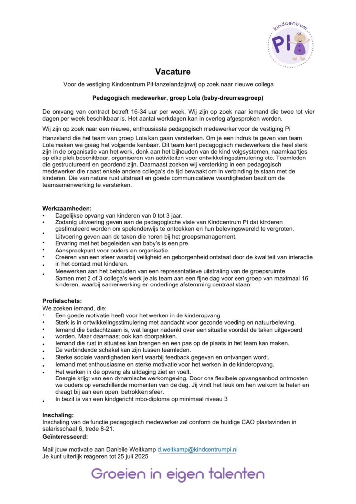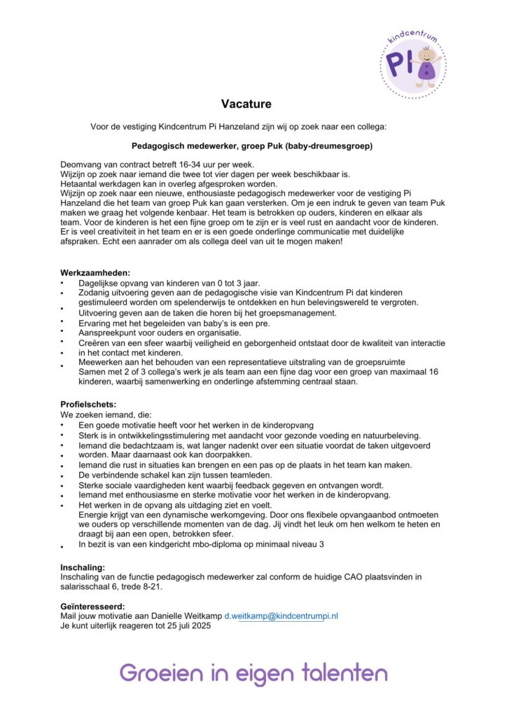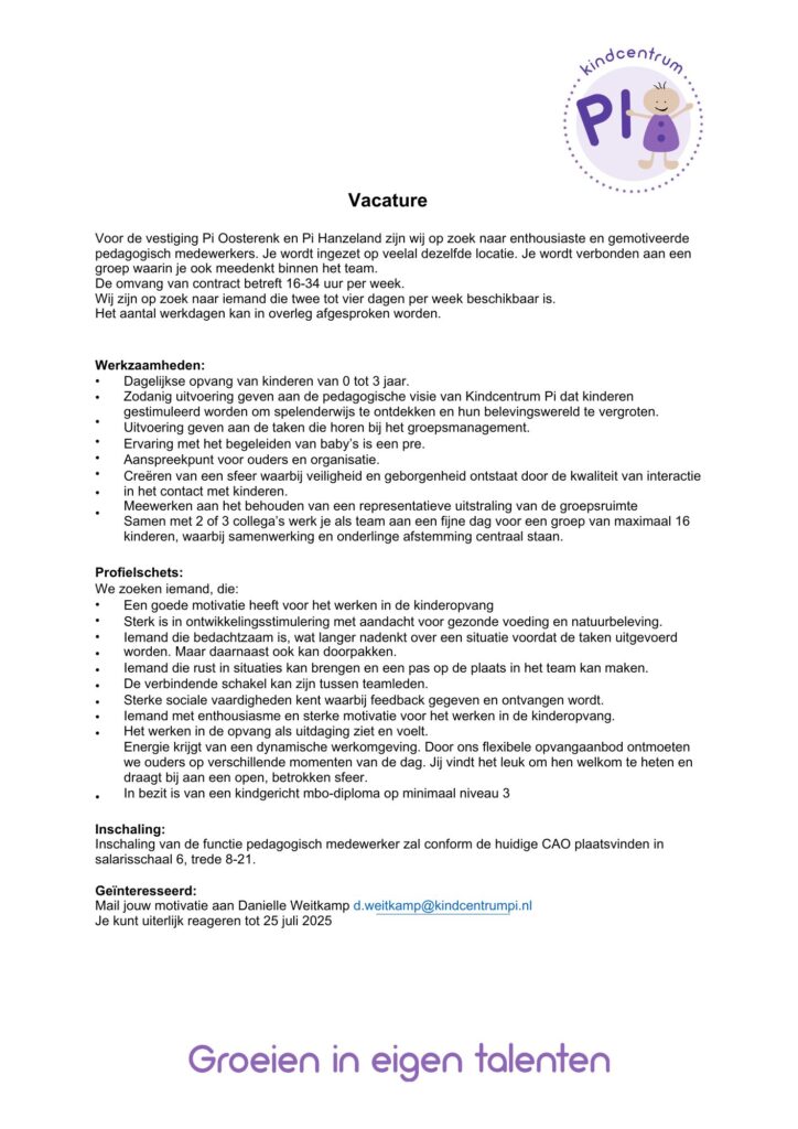 Bij Kindcentrum Pi staan vanaf september 2025 drie vacatures open. Ben jij op zoek naar een warme, betrokken werkplek waar samenwerking centraal staat en geen dag hetzelfde is?